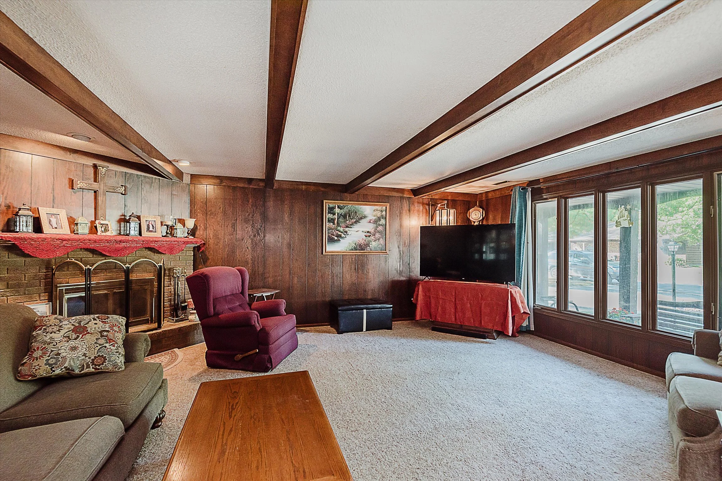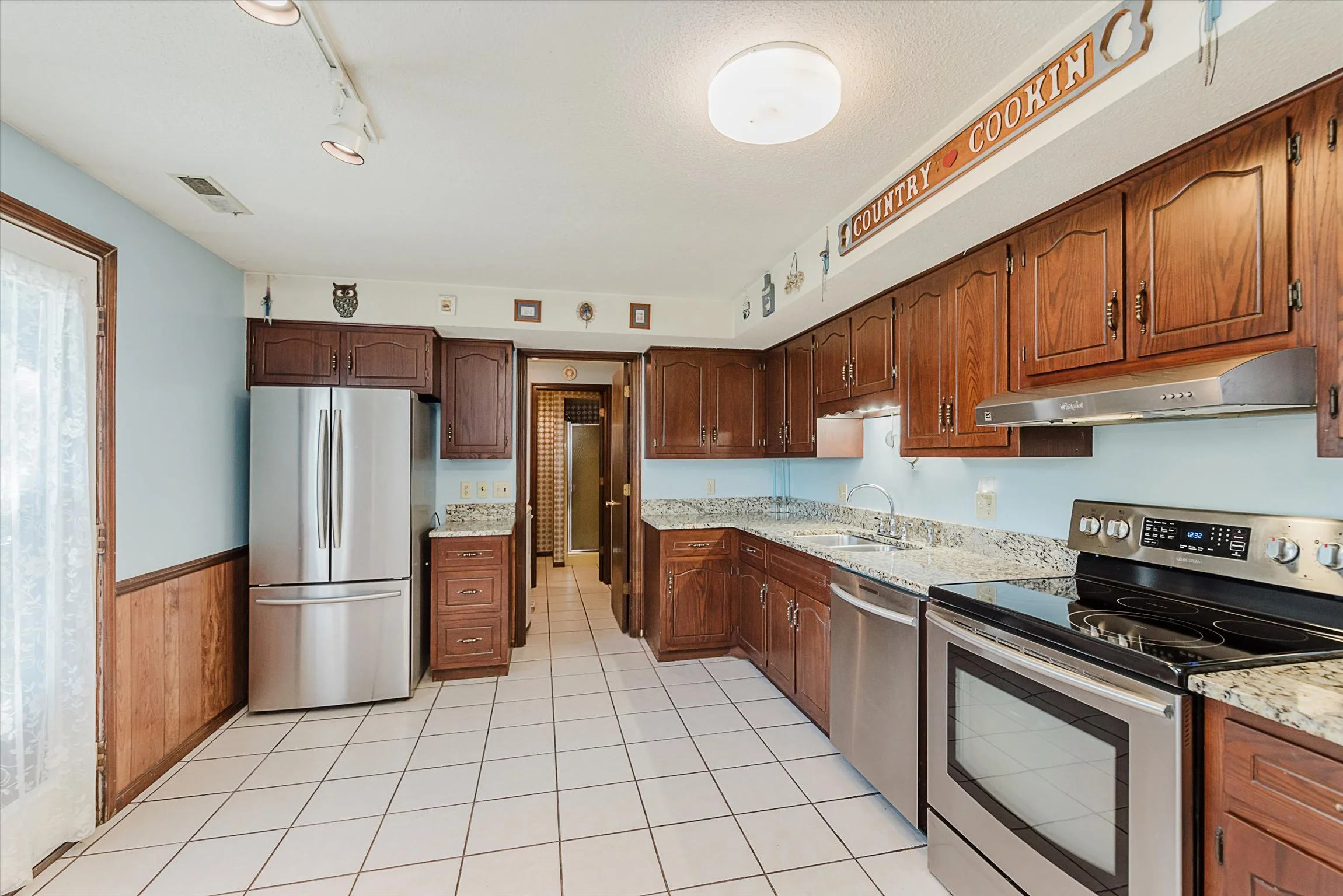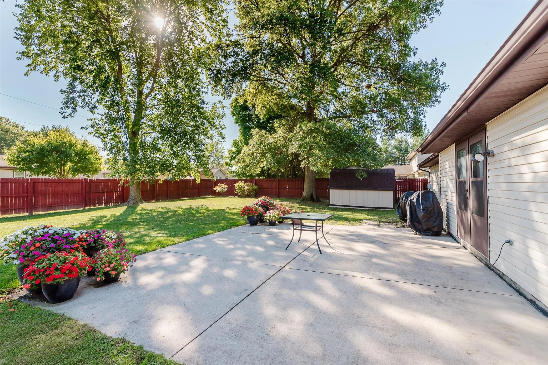 1 story, 1,462 square feet brick-accent ranch on a quiet Maple Ct cul-de-sac in The Oaks. A welcoming front patio sets the tone. Inside, the living room boasts a wood beam-ceiling with a brick fireplace, large picture window, and plenty of gathering space. The eat-in kitchen features tile flooring finished with granite countertops, stainless steel appliances, and loads of rich wood cabinetry. The home offers 3 comfortable bedrooms and 2 full bathrooms. The primary bedroom includes an en-suite bath. A true laundry/mudroom sits between the kitchen and the attached 2-car garage for everyday convenience. Out back, the fully fenced yard is made for your lifestyle and enjoyment—including an expansive concrete patio plus a storage shed. Solid home, functional layout, low-traffic street, and minutes to town amenities. Move-in ready with room to make it yours!